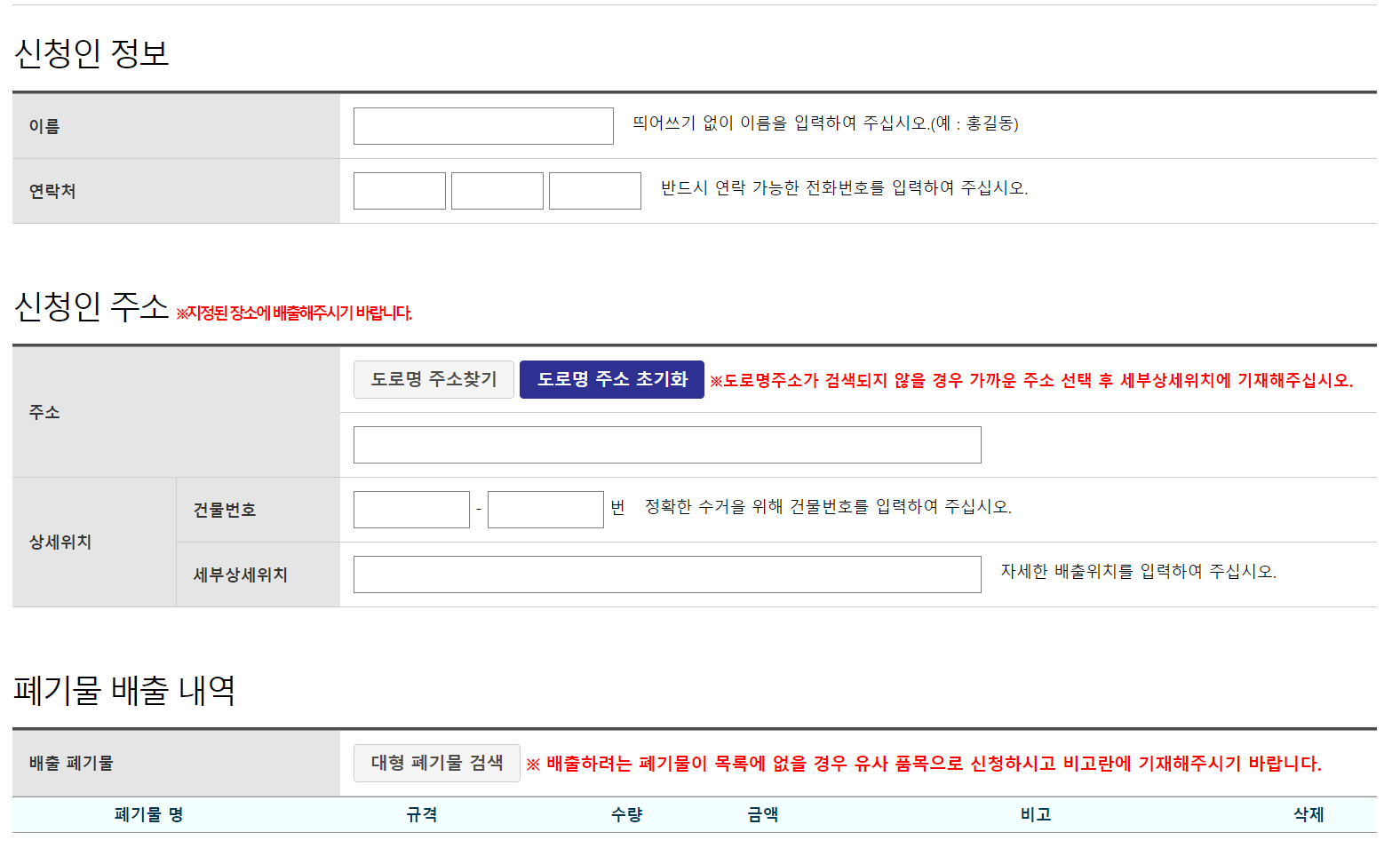 가평군청의 인터넷신고 페이지에 접속하시게 되면, 간단하게 배출자 정보, 배출장소, 배출품목 등을 입력하시고 품목에 맞는 수수료를 결제하시면 모든 과정은 쉽게 끝납니다.