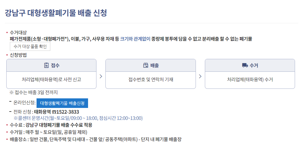강남구청에서는 종량제 봉투에 담을 수 없는 폐기물을 대형폐기물로 분류해 태화용역(1522-3833) 업체를 통해 접수를 받아 수거를 진행하고 있습니다.