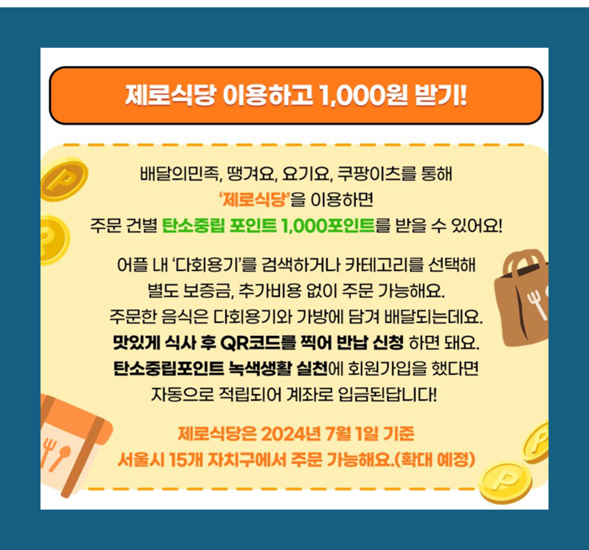 " 배달의민족, 땡겨요, 요기요, 쿠팡이츠를 통해 제로식당(다회용기 사용처)을 이용하면 건 별로 탄소중립 포인트 1,000원을 적립받으실 수 있습니다. 배달어플 내에서 다회용기로 검색하거나 카테고리를 선택해 별도의 보증금이나 추가비용 없이 주문하실 수 있습니다. 신청방법 및 제로식당 리스트는 연관 포스팅에서 더 확인해보세요."