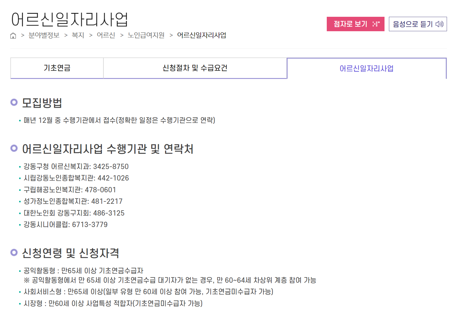 대표적으로 어르신 일자리 사업이 있는데요, 참여하기 위해선 신청기간,대상자 등의 조건이 있으니