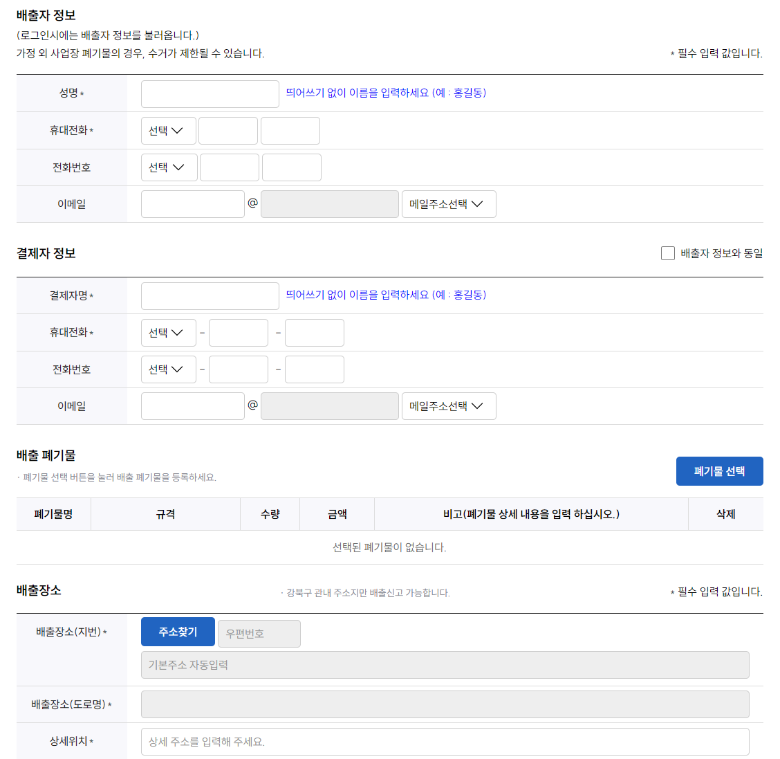 배출자의 정보, 배출 폐기물, 배출장소를 선택하신 후 입력하고 수수료를 납부하시면 필증을 바로 출력하실 수 있습니다.