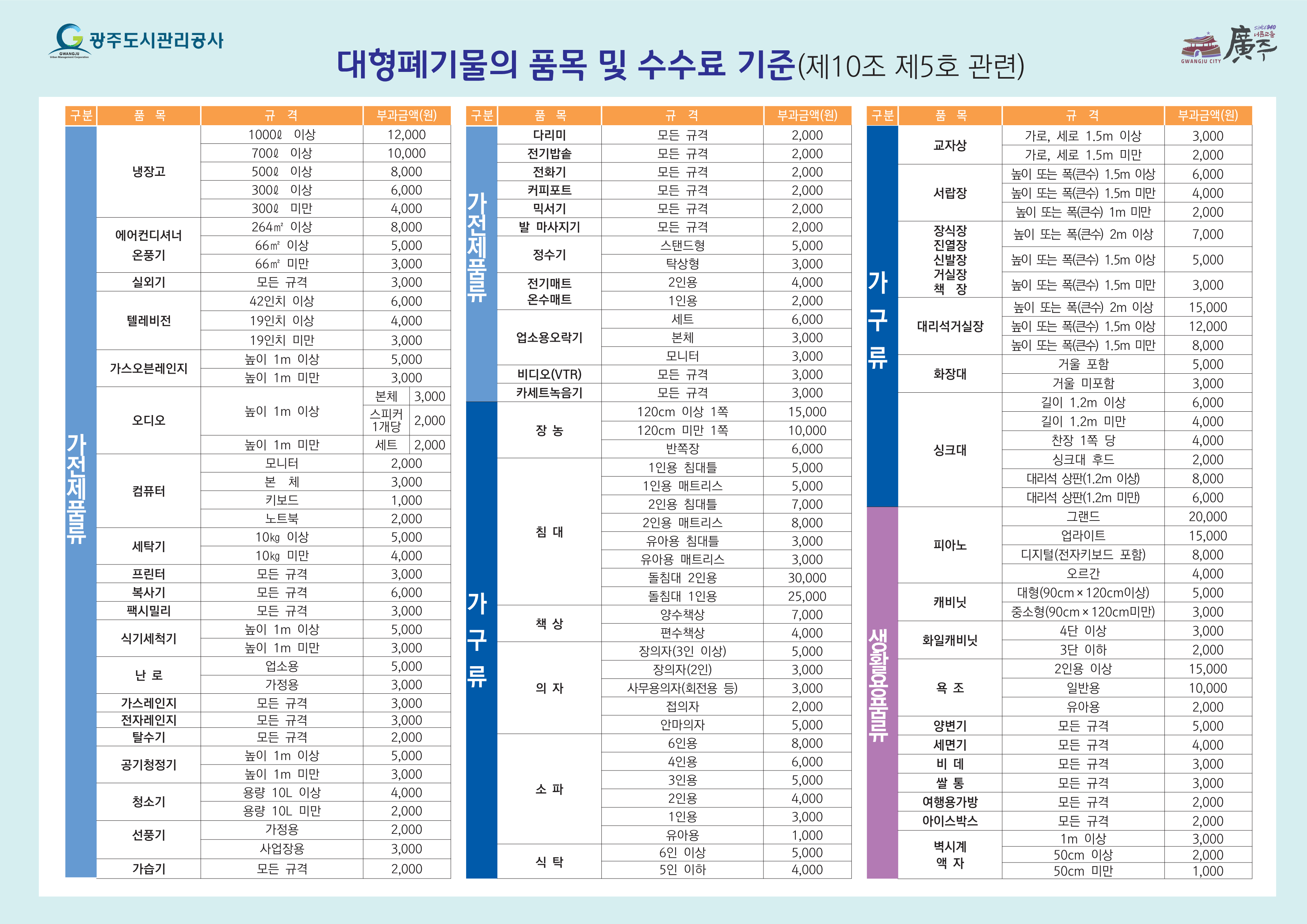 | 의류, 이불 | 의류는 종량제봉투에 담아 배출, 이불은 큰 봉투 또는 마대에 담아 대형폐기물로 배출 | |