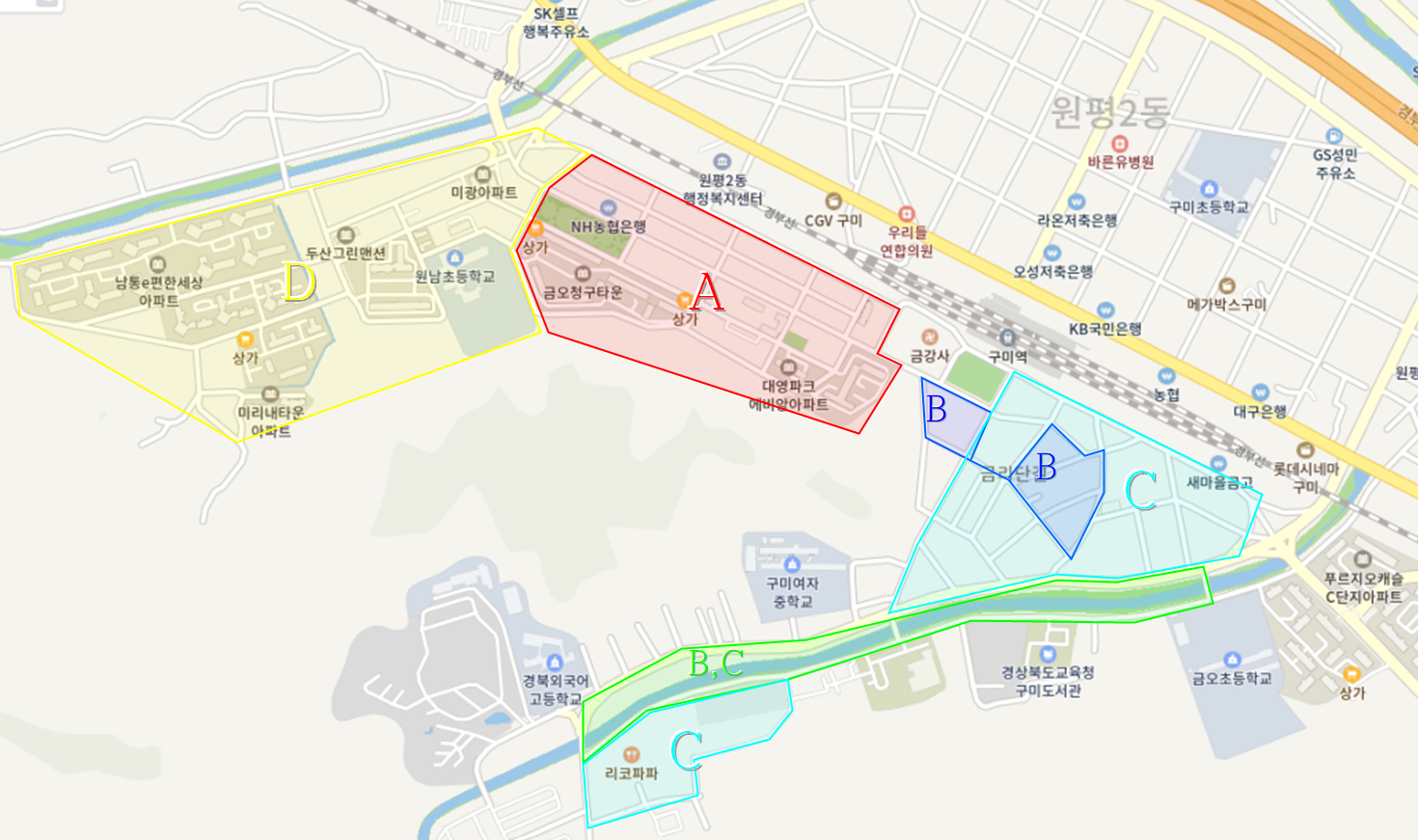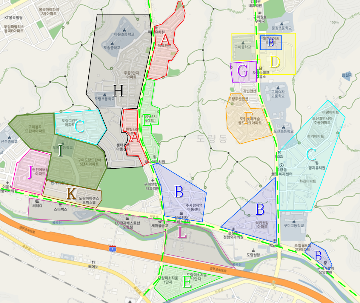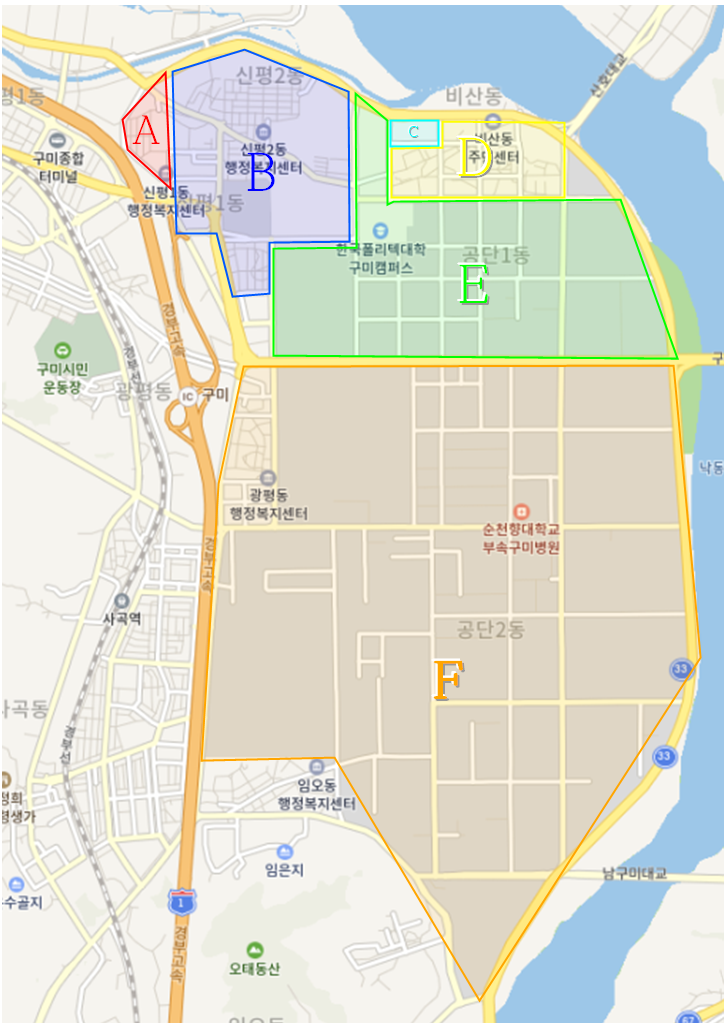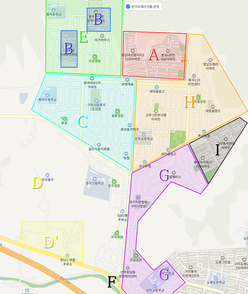 | D | 목 | 목·금 | 자동차매매상사, 해원장례식장, 선기1동 경로당, 구미대학교, 실내테니스장, 오로골, 축산농협 |