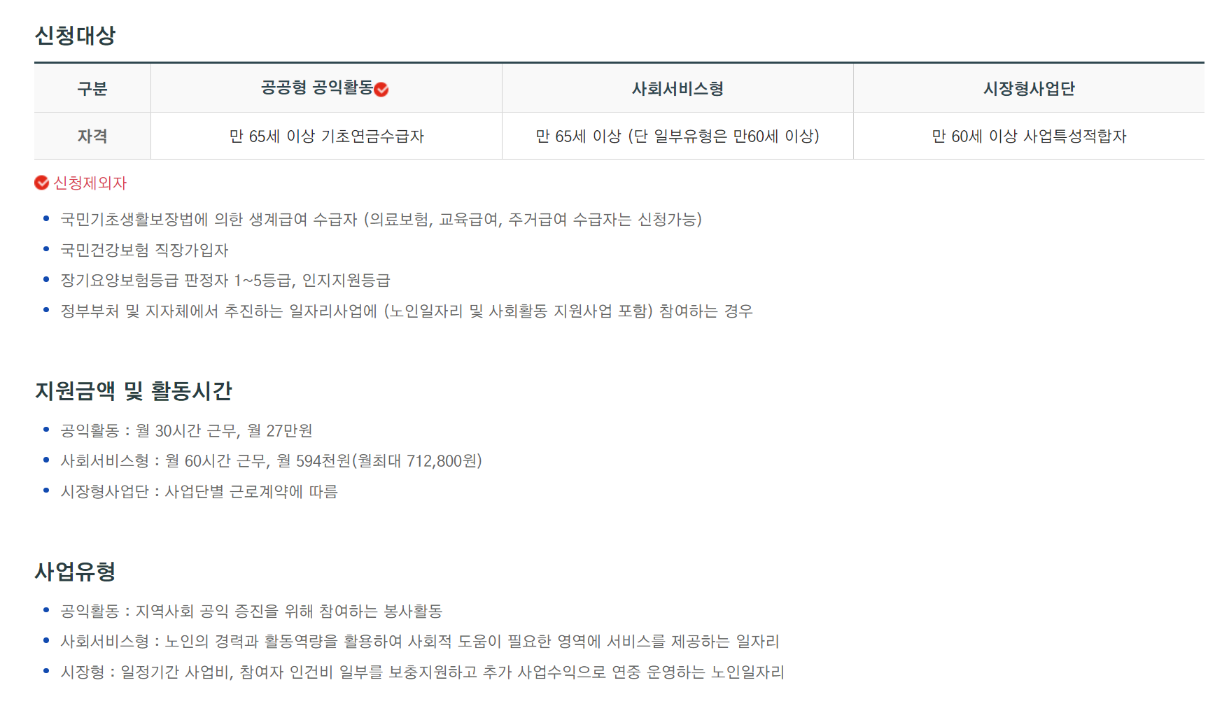 | 공공형 | 공익활동 | 노인들이 자신의 만족감과 성취감을 높이고 지역사회의 이익을 증진시키기 위해 참여하는 활동 | 지자체 경상보조 | 봉사 (사회공헌) |