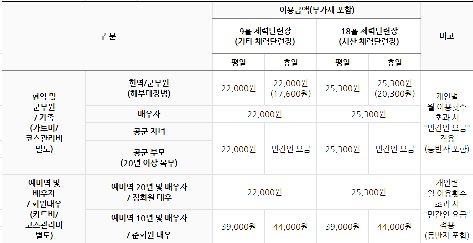 | 현역/군무원 | 각 월 3회 이내 | 월 8회 이내 | 전 체력단련장 |