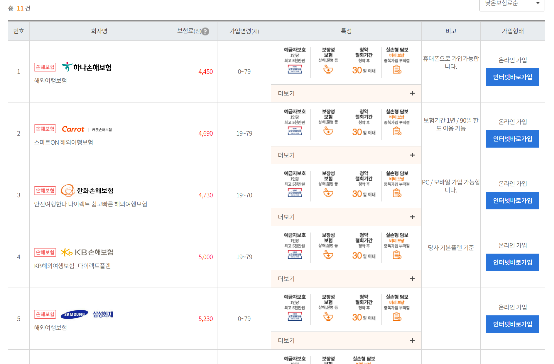 거두절미하고 첫번째는, 카카오페이손해보험 여행자보험이고, 두번째는, 보험다모아를 통한 최저가 검색입니다.