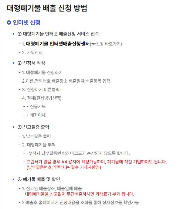 폐가구 처리 방법 고민많으셨죠? 일반적으로 폐가구는 대형폐기물은 인터넷 신고를 통해 간단하게 배출신고 가능합니다. 배출 신청자 정보와 배출 장소정보, 배출품목을 선택한 후 신청하면 스