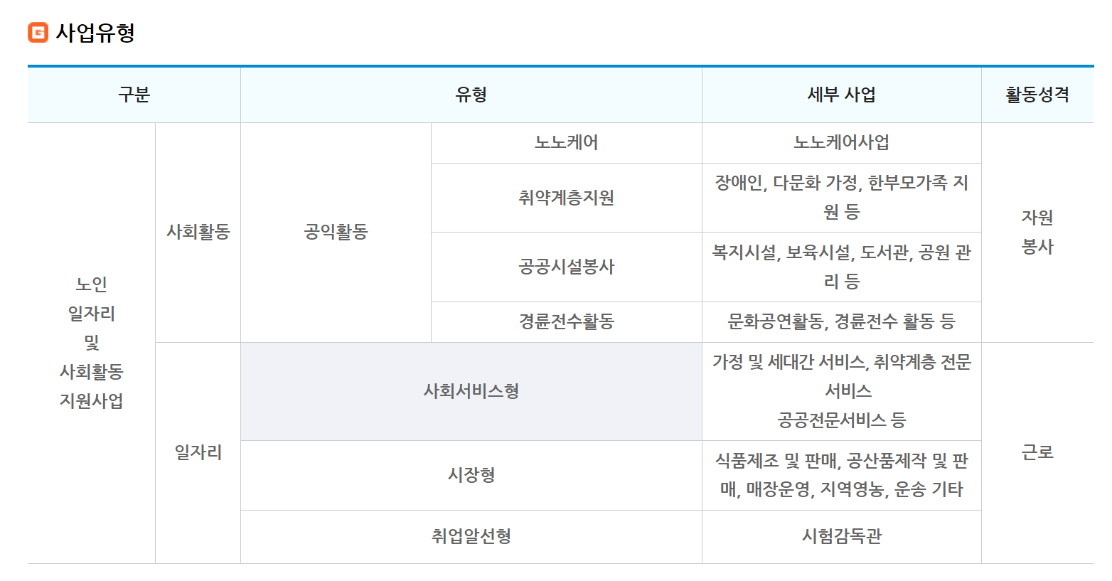 | 공공형 | 공익활동 | 노인들이 자신의 만족감과 성취감을 높이고 지역사회의 이익을 증진시키기 위해 참여하는 활동 | 지자체 경상보조 | 봉사 (사회공헌) |