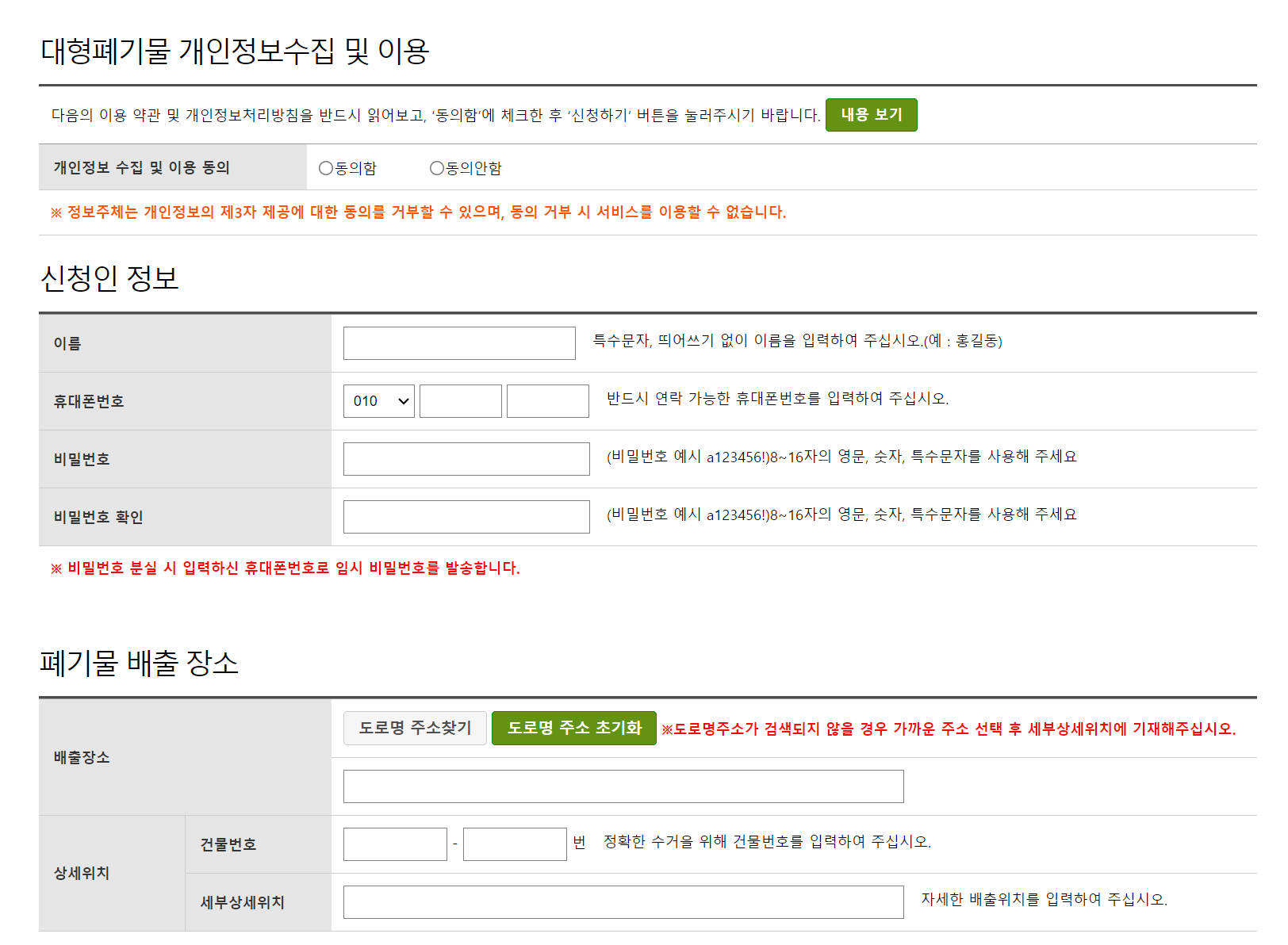 광진구청의 대형폐기물 신고페이지에 접속하셔서 신청인 정보, 폐기물 배출장소를 입력하시고