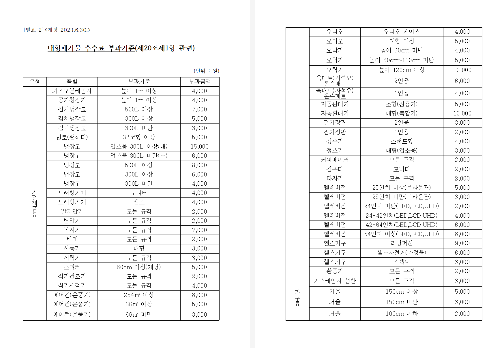 구리시 대형폐기물 배출 수수료는 아래와 같습니다.