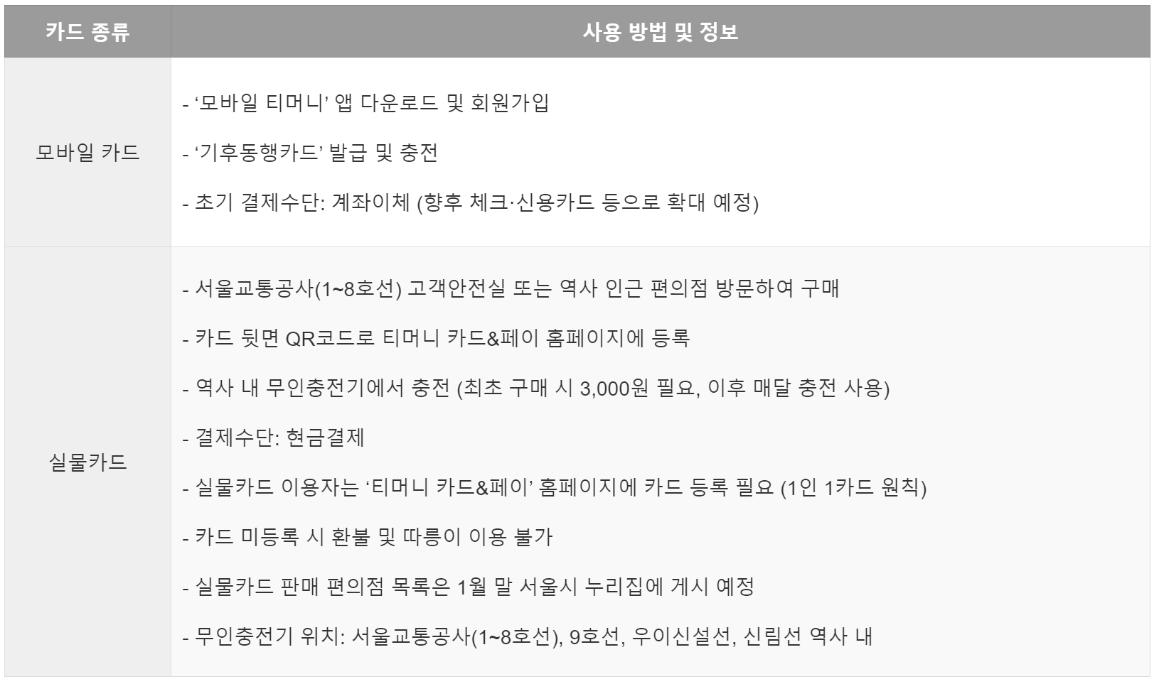 | 모바일 카드 | - ‘모바일 티머니’ 앱 다운로드 및 회원가입 - ‘기후동행카드’ 발급 및 충전 - 초기 결제수단: 계좌이체 (향후 체크·신용카드 등으로 확대 예정) |