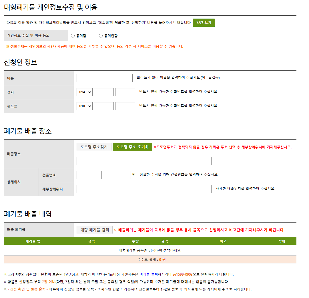 김천시청의 인터넷신고 페이지에 접속하시게 되면, 간단하게 배출자 정보, 배출장소, 배출품목 등을 입력하시고 품목에 맞는 수수료를 결제하시면 모든 과정은 쉽게 끝납니다.