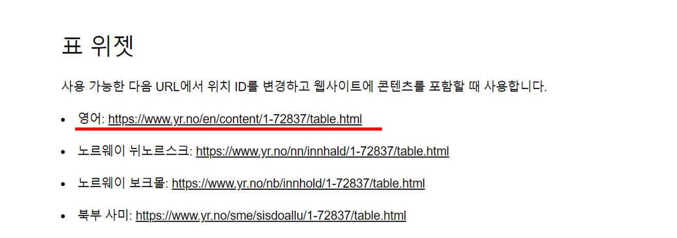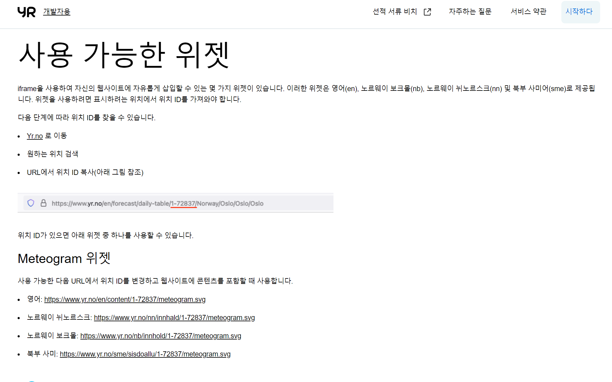 1. 노르웨이기상청 개발자용 웹페이지 접속 (https://developer.yr.no/doc/guides/available-widgets/)