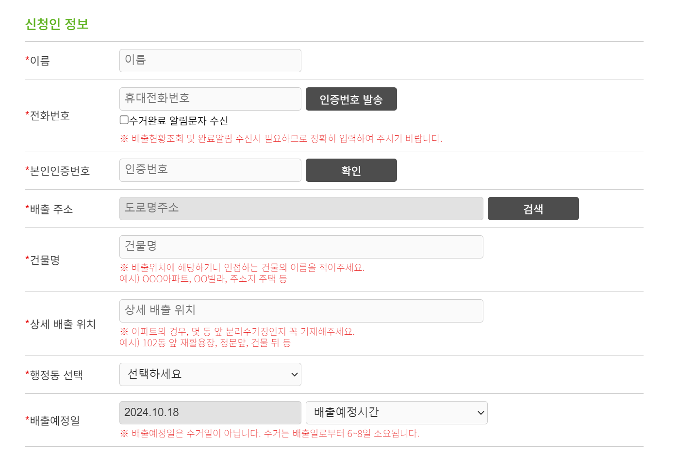 구청의 인터넷신고 페이지에 접속하시게 되면, 간단하게 배출자 정보, 배출장소, 배출품목 등을 입력하시고 품목에 맞는 수수료를 결제하시면 모든 과정은 쉽게 끝납니다.