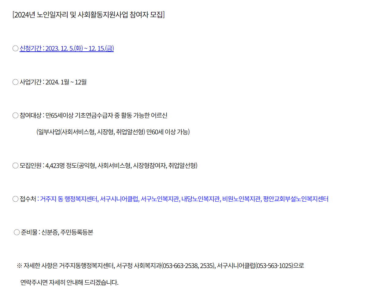바로 지원가능한 대구서구 노인일자리 구인구직 일자리 정보만 모아봤습니다.