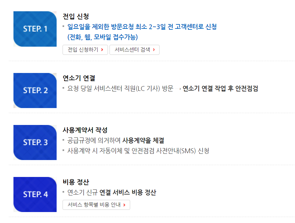 절차는 전입 신청, 연소기 연결 및 안전점검, 사용계약서 작성, 그리고 비용 정산의 순서로 진행됩니다.