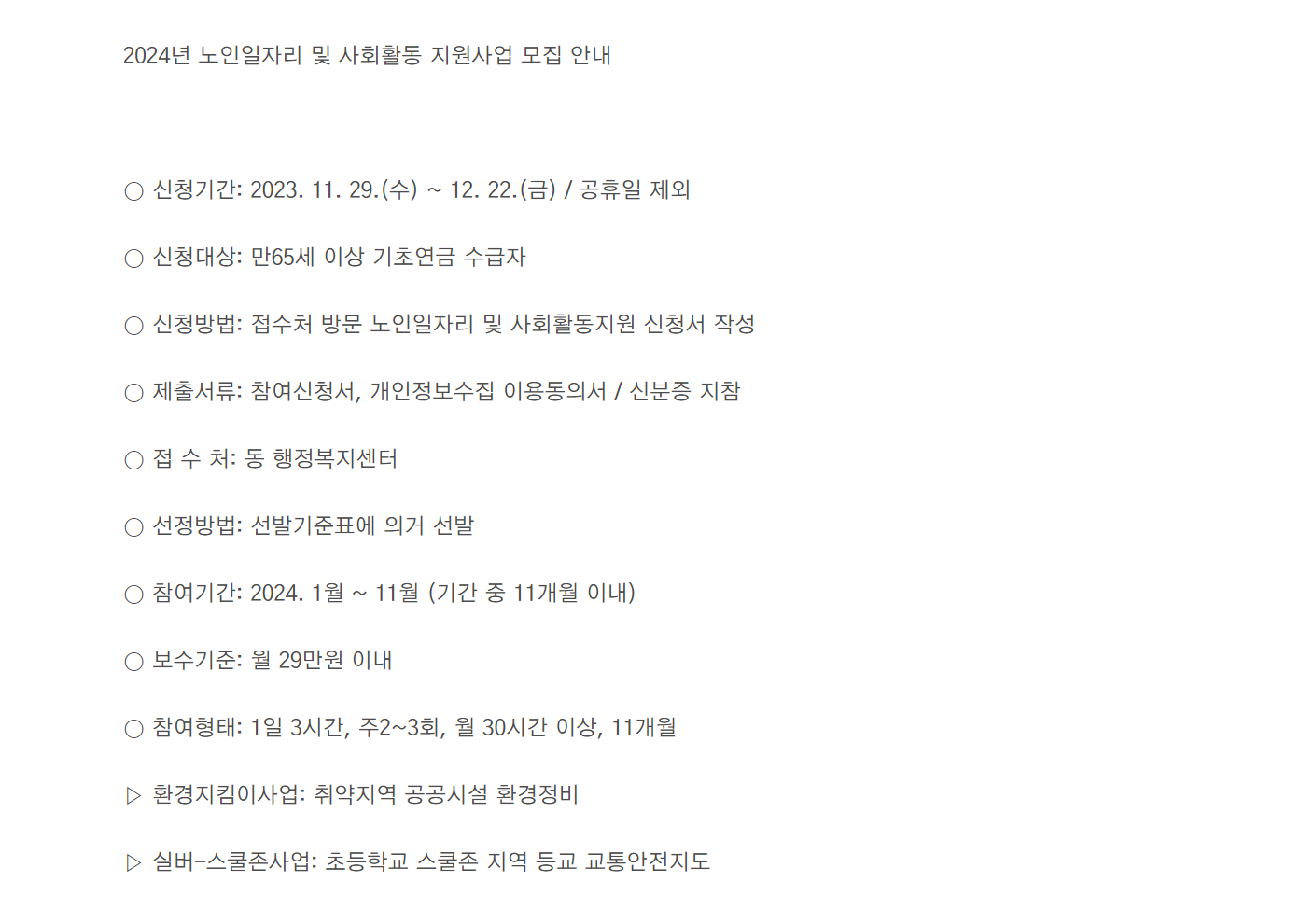 대표적으로 어르신 일자리 사업이 있는데요, 참여하기 위해선 신청기간,대상자 등의 조건이 있으니