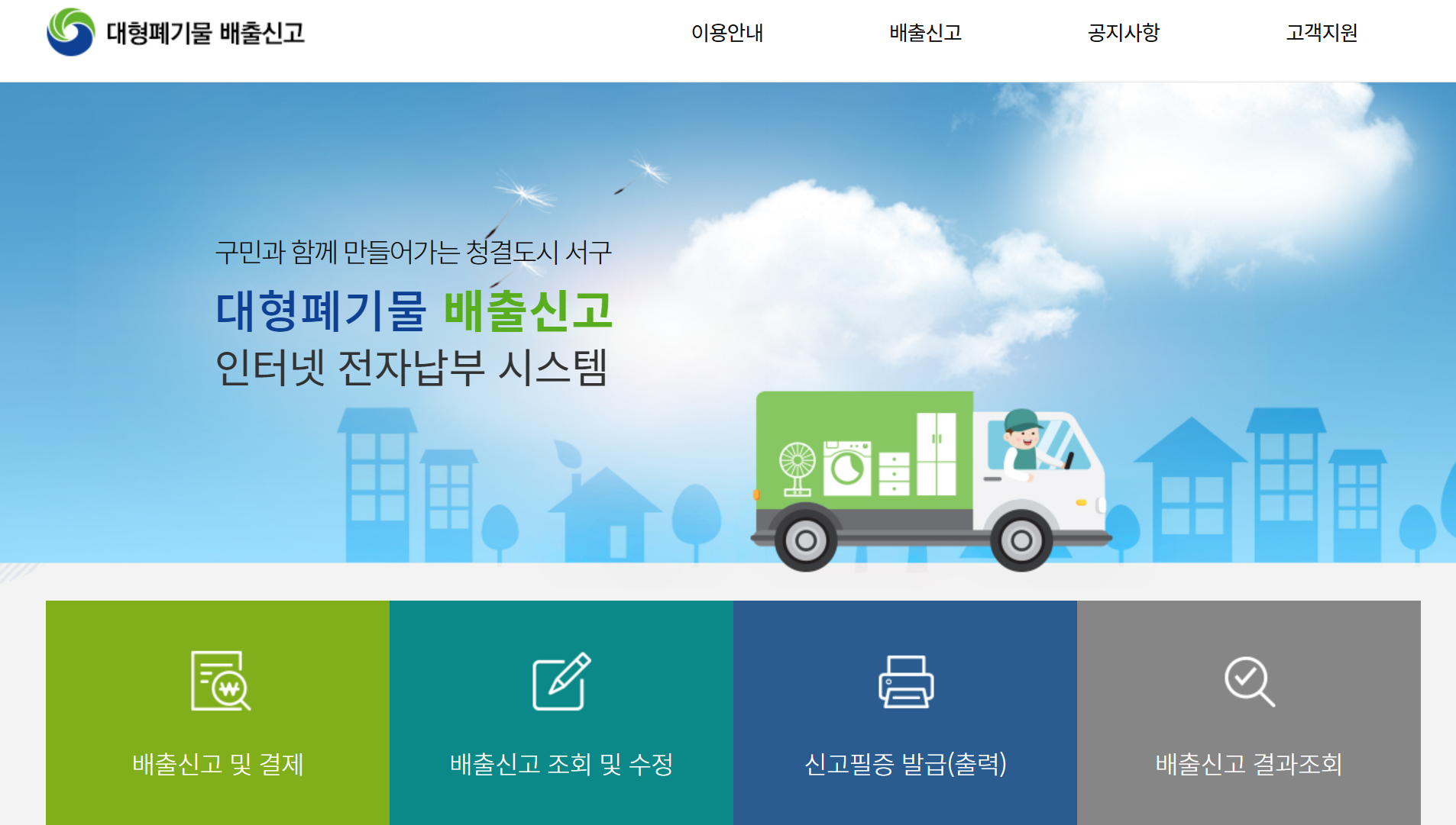 서구청의 인터넷신고 페이지에 접속하시게 되면, 간단하게 배출자 정보, 배출장소, 배출품목 등을 입력하시고 품목에 맞는 수수료를 결제하시면 모든 과정은 쉽게 끝납니다.