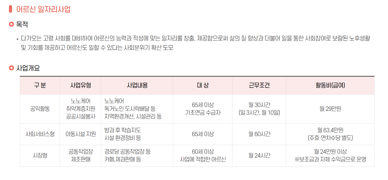 | 공공형 | 공익활동 | 노인들이 자신의 만족감과 성취감을 높이고 지역사회의 이익을 증진시키기 위해 참여하는 활동 | 지자체 경상보조 | 봉사 (사회공헌) |