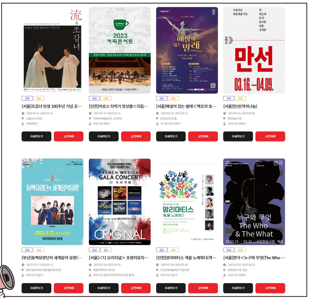 2. 원하는 공연 또는 전시를 선택한 후, 예매를 진행합니다.