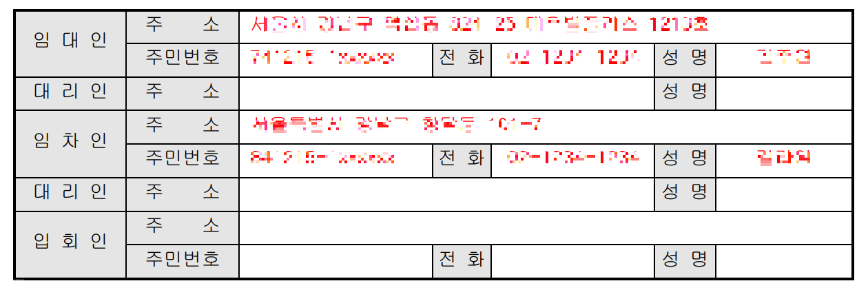 대리인을 통해 계약을 체결한 경우, 대리인의 개인 정보를 본인 정보와 함께 계약서에 명시해야 합니다. 입회인이 있는 경우도 이와 동일하며, 대리인과 입회인은 선택적으로 포함될 수 있습니다.