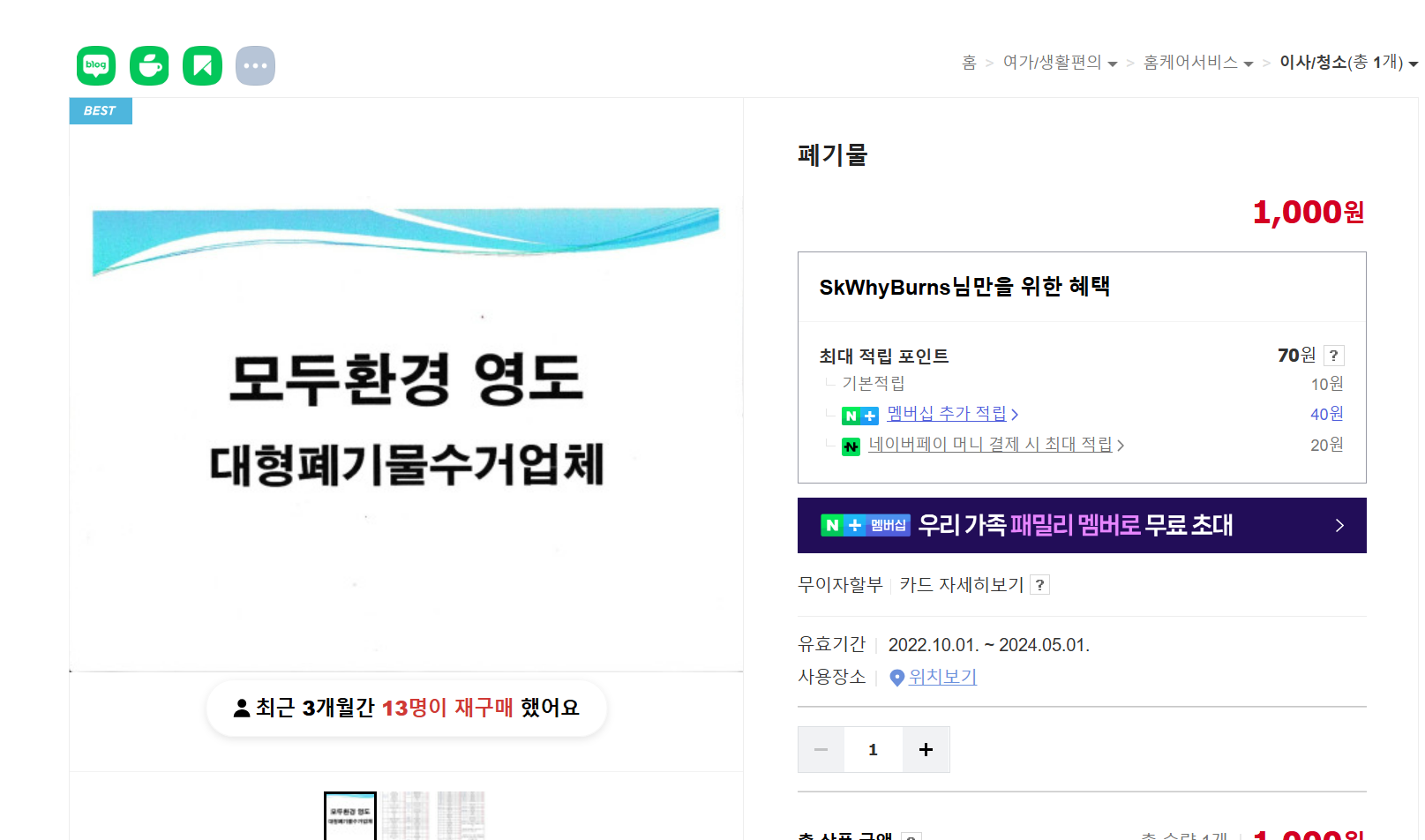 모두환경영도 검색 → 상품 Q&A 작성(성명, 전화번호, 주소 등) → 업체 전화 후 방문 (수수료 결정 및 결제 요청) → 네이버스토어 결제 진행
