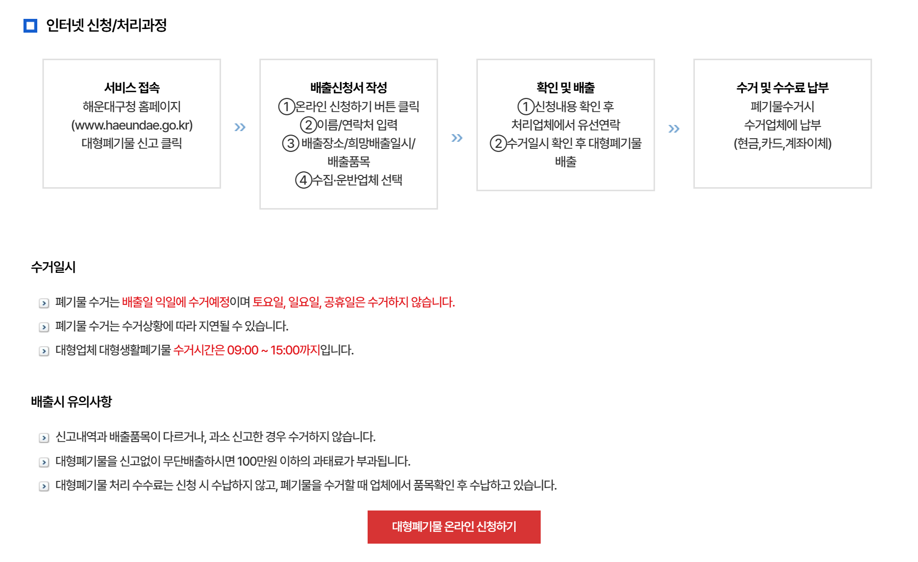 부산 해운대구 대형폐기물 온라인 신고방법은 생각보다 매우 간단합니다. 우선 지역구 홈페이지로 접속하신 후에 대형폐기물을 검색하시면 바로 신청할 수 있는 메뉴가 나옵니다. 아래에서 조금 더 알아보겠습니다.