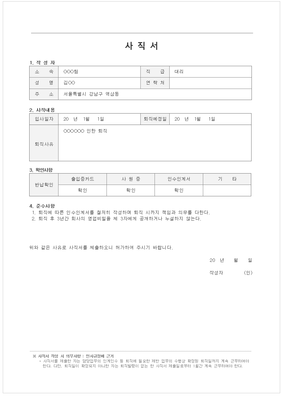 • 날짜 협의: 사직날짜는 회사와 충분한 협의 후 작성합니다. 이는 회사가 후임자를 준비하거나 인수인계를 할 수 있는 시간을 제공하기 위함입니다.