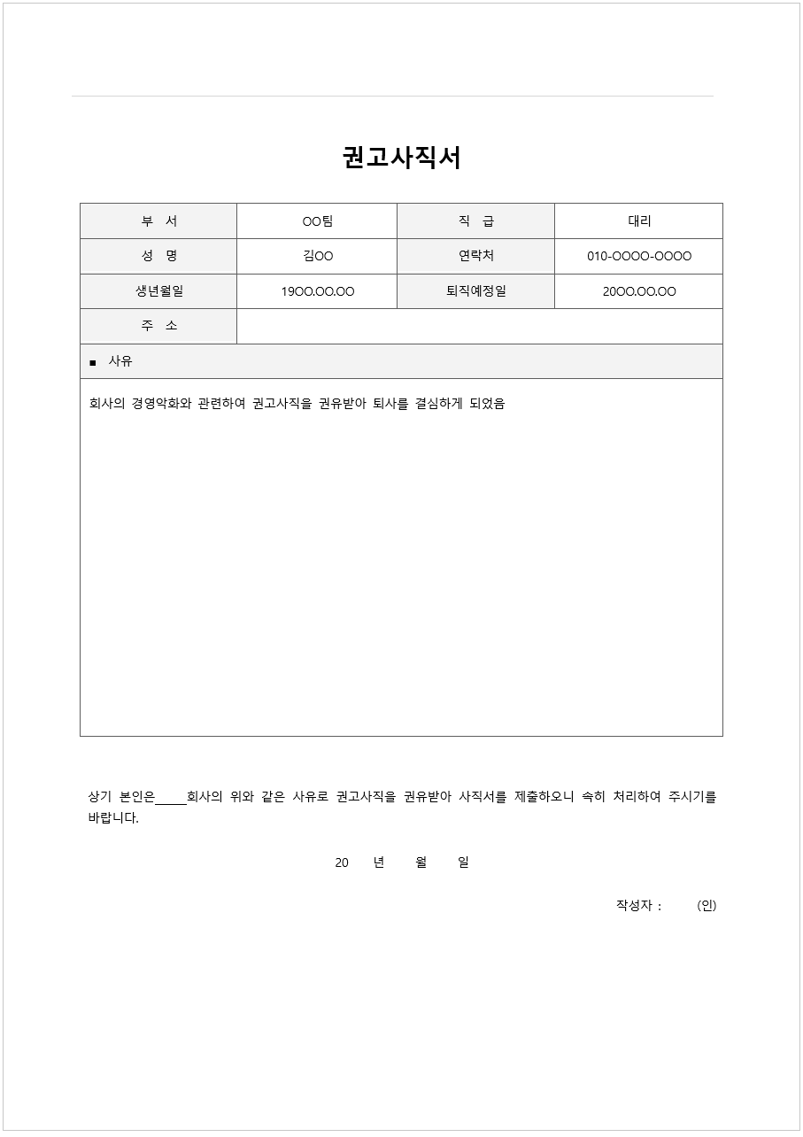 • 퇴직 사유 구체화: 퇴직 사유는 간단하면서도 구체적으로 작성합니다. 예를 들어, '개인적인 이유'보다는 '가족의 건강 문제로 인해 지방으로 이사가야 함'이 더 명확합니다.