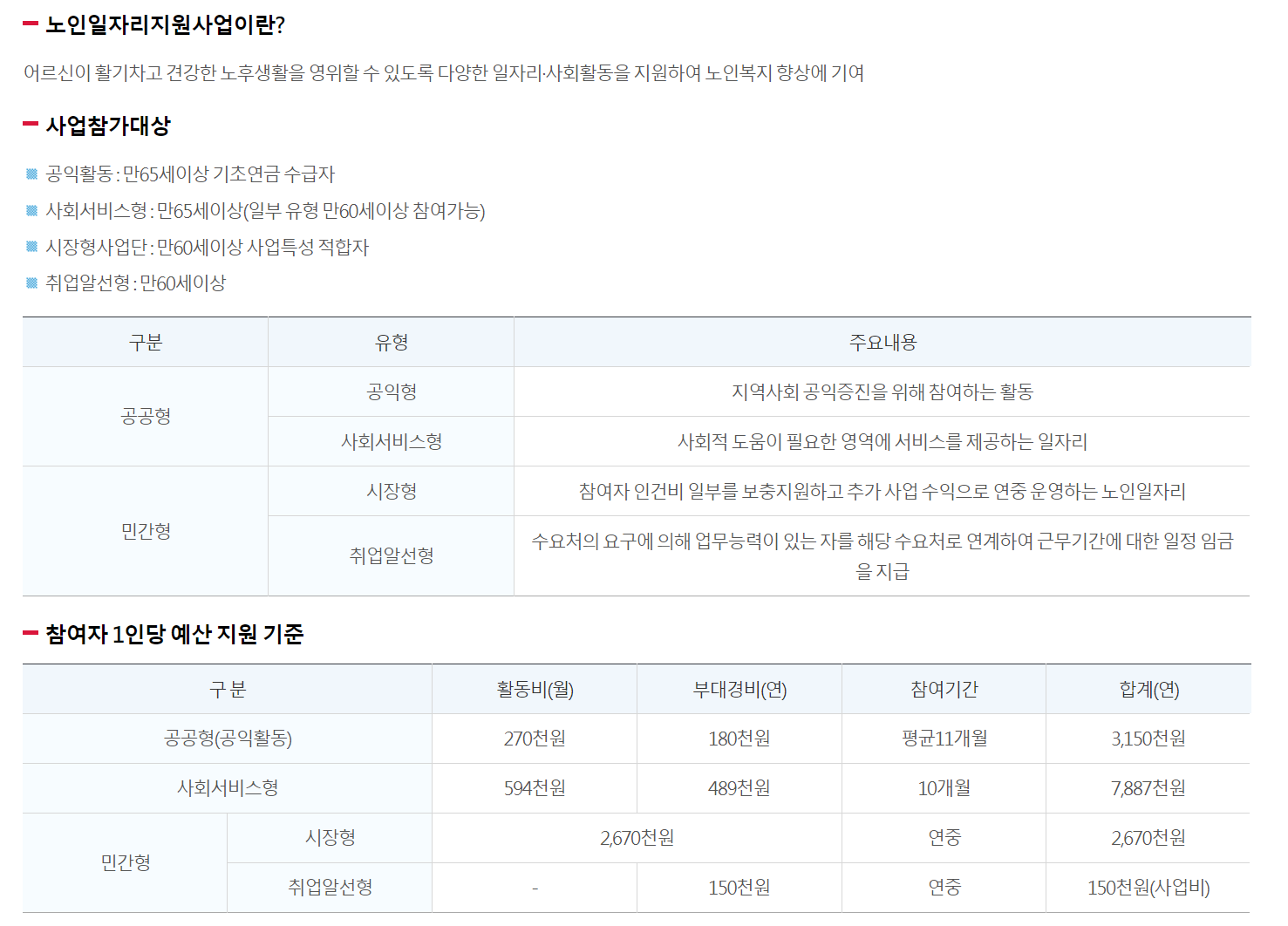 | 공공형 | 공익활동 | 노인들이 자신의 만족감과 성취감을 높이고 지역사회의 이익을 증진시키기 위해 참여하는 활동 | 지자체 경상보조 | 봉사 (사회공헌) |