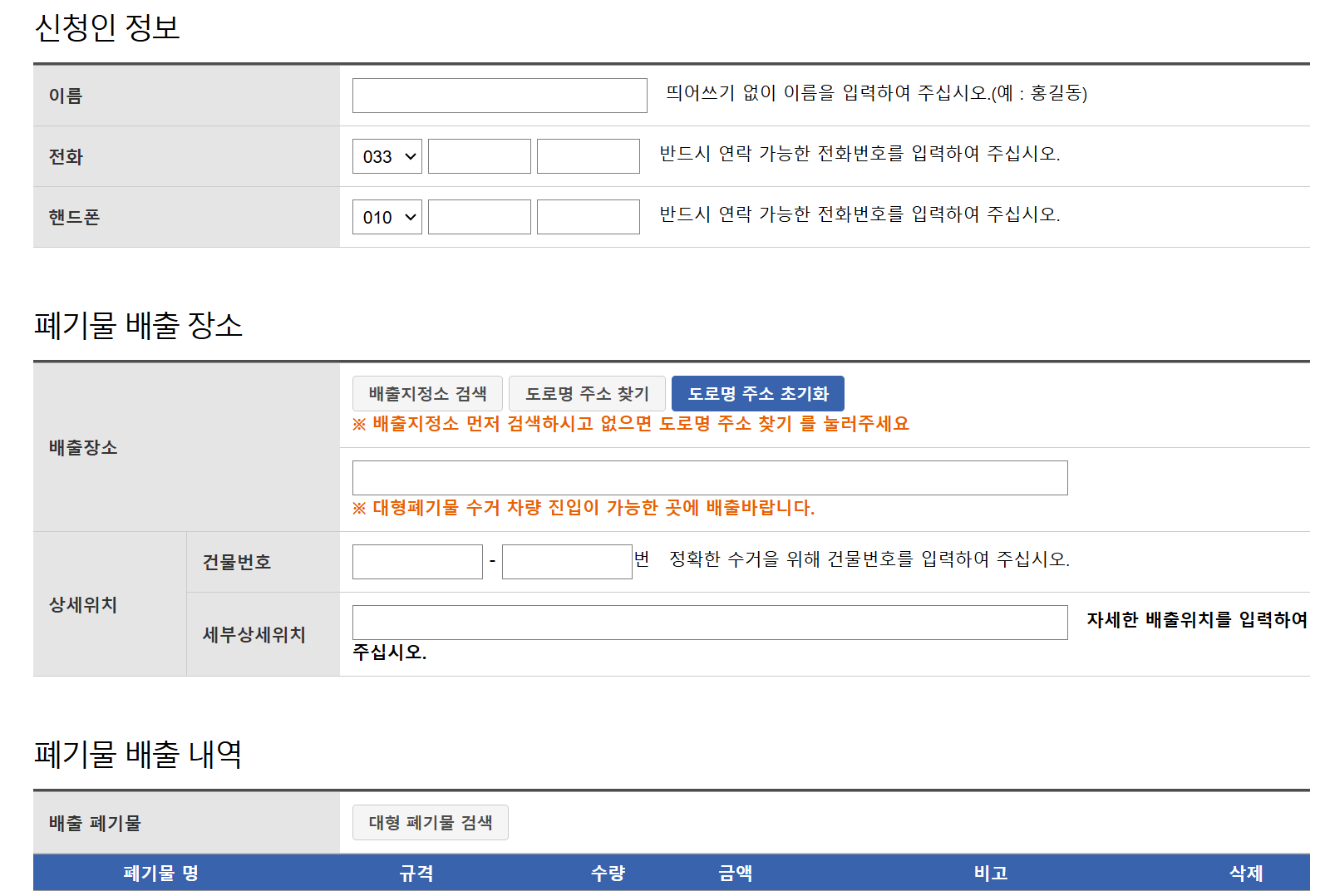 동해시청의 인터넷신고 페이지에 접속하시게 되면, 간단하게 배출자 정보, 배출장소, 배출품목 등을 입력하시고 품목에 맞는 수수료를 결제하시면 모든 과정은 쉽게 끝납니다.