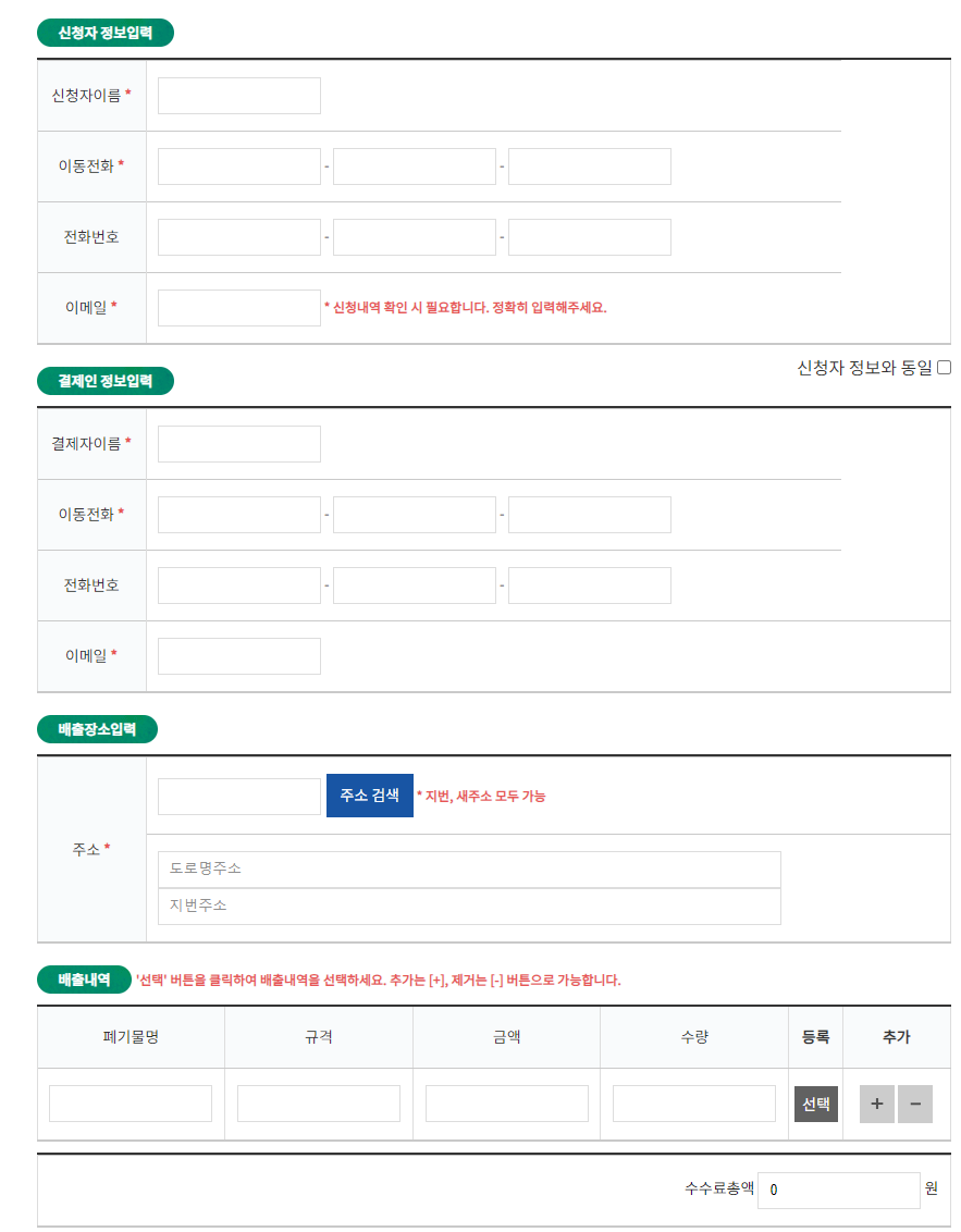 서대문구청의 인터넷신고 페이지에 접속하시게 되면, 간단하게 배출자 정보, 배출장소, 배출품목 등을 입력하시고 품목에 맞는 수수료를 결제하시면 모든 과정은 쉽게 끝납니다.