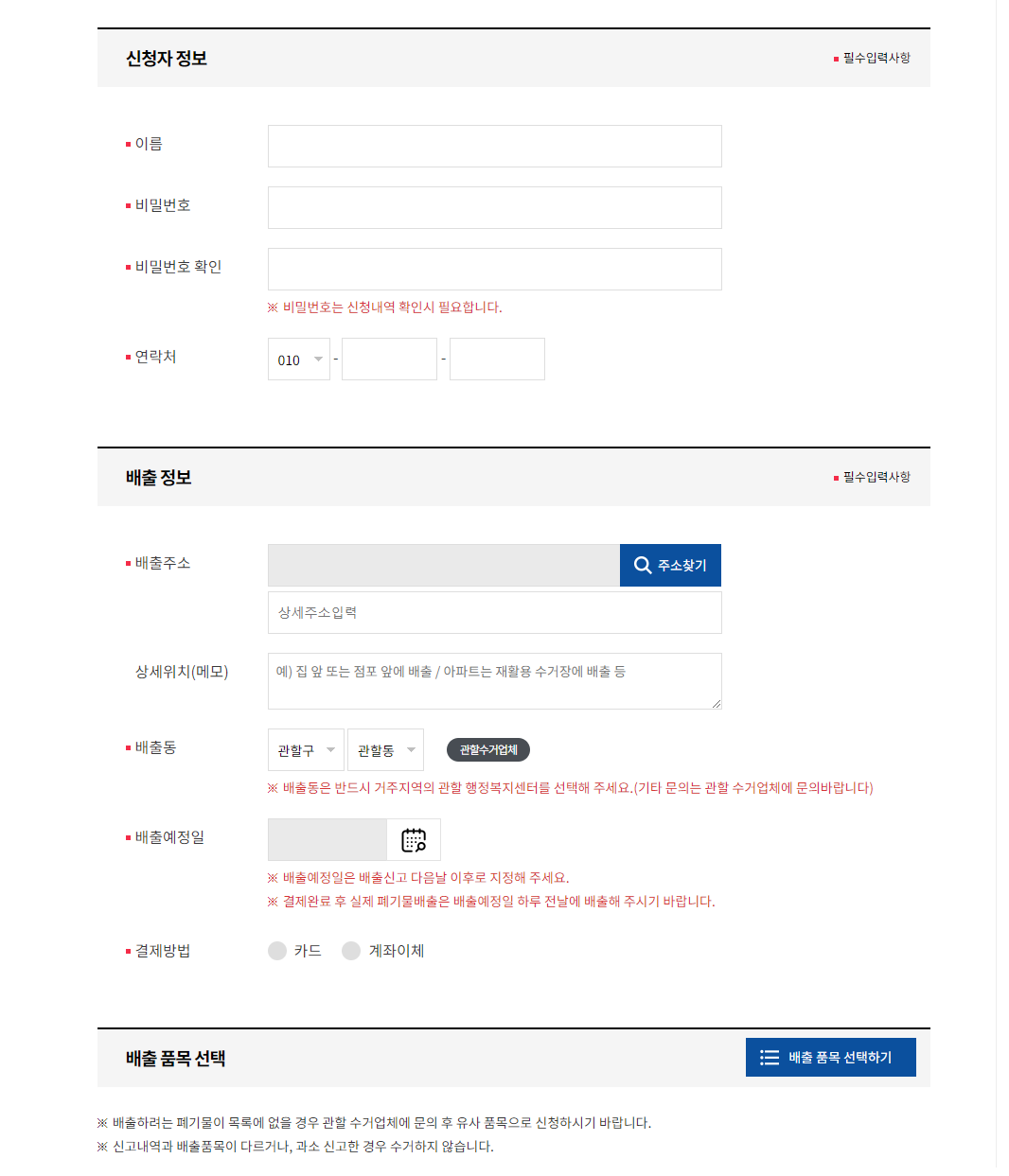 성남시의 인터넷신고 페이지에 접속하시게 되면, 간단하게 배출자 정보, 배출장소, 배출품목 등을 입력하시고 품목에 맞는 수수료를 결제하시면 모든 과정은 쉽게 끝납니다.