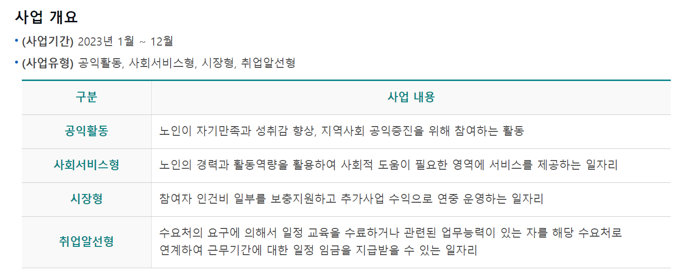 | 공공형 | 공익활동 | 노인들이 자신의 만족감과 성취감을 높이고 지역사회의 이익을 증진시키기 위해 참여하는 활동 | 지자체 경상보조 | 봉사 (사회공헌) |