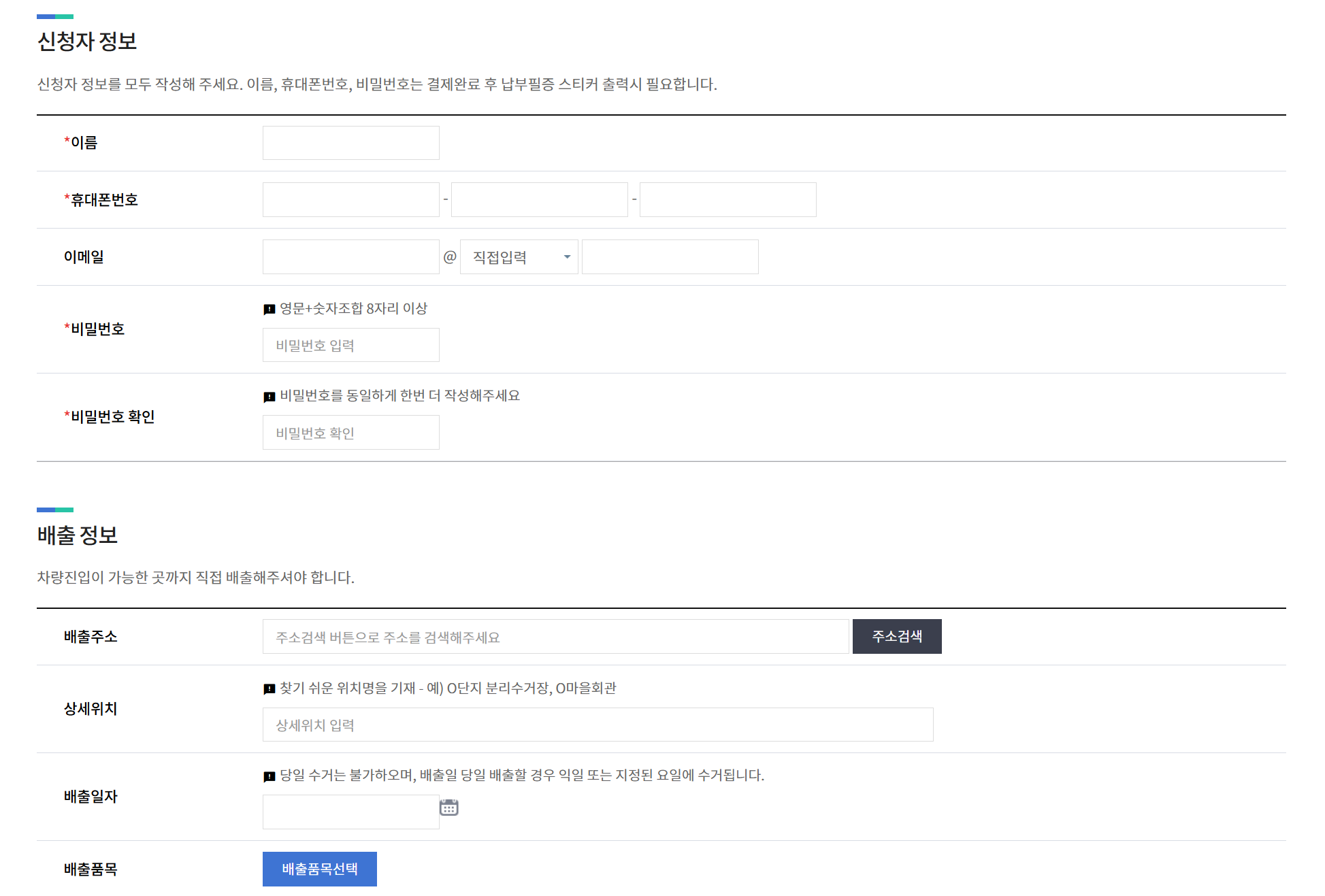 세종시청의 인터넷신고 페이지에 접속하시게 되면, 간단하게 배출자 정보, 배출장소, 배출품목 등을 입력하시고 품목에 맞는 수수료를 결제하시면 모든 과정은 쉽게 끝납니다.