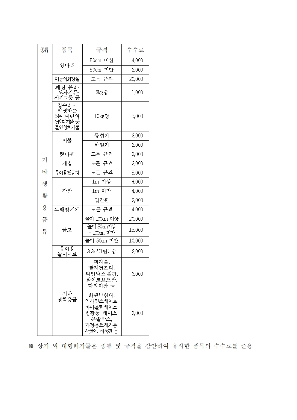 각 지자체에서 고지하는 품목 별 수거비용을 조회하는 것이 가장 정확합니다.