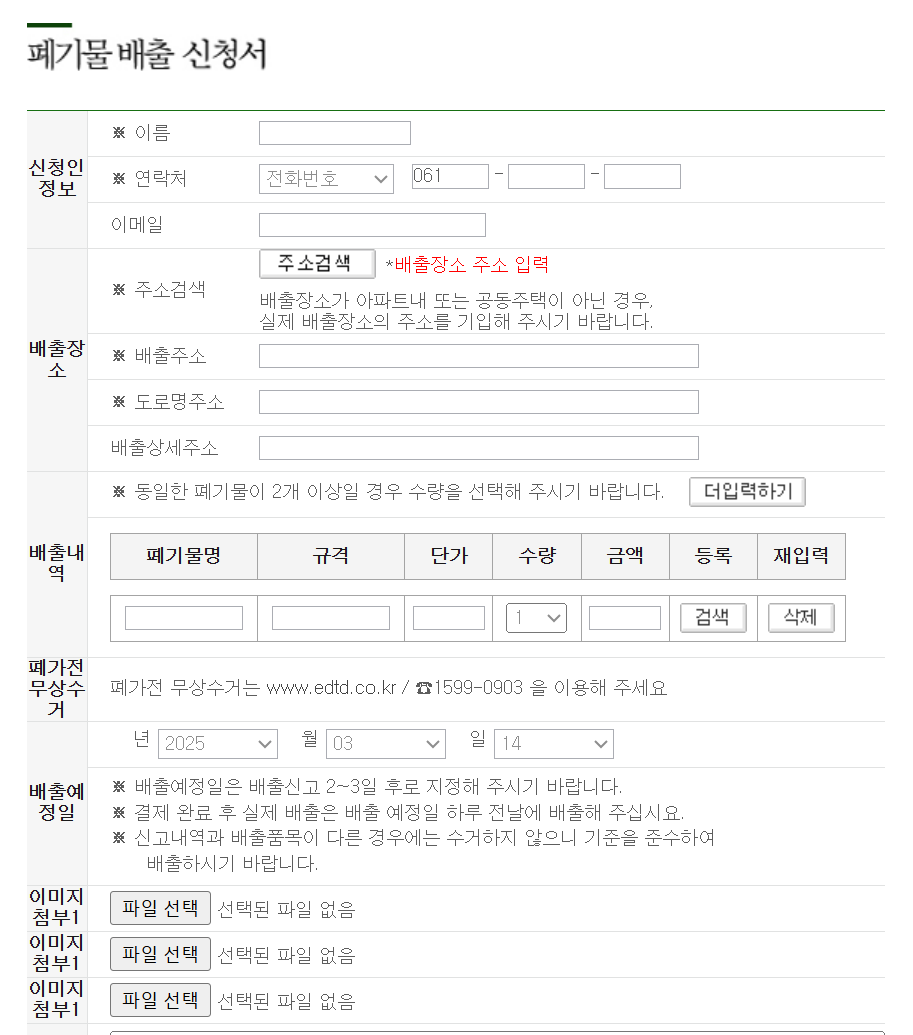 순천시청의 인터넷신고 페이지에 접속하시게 되면, 간단하게 배출자 정보, 배출장소, 배출품목 등을 입력하시고 품목에 맞는 수수료를 결제하시면 모든 과정은 쉽게 끝납니다.
