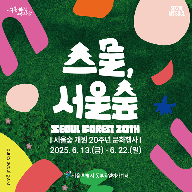 스물 서울숲은 서울숲 개원 20주년을 기념하는 문화행사입니다. 2025년 6월 13일부터 22일까지 서울숲에서 전시, 체험, 공연이 펼쳐집니다.
