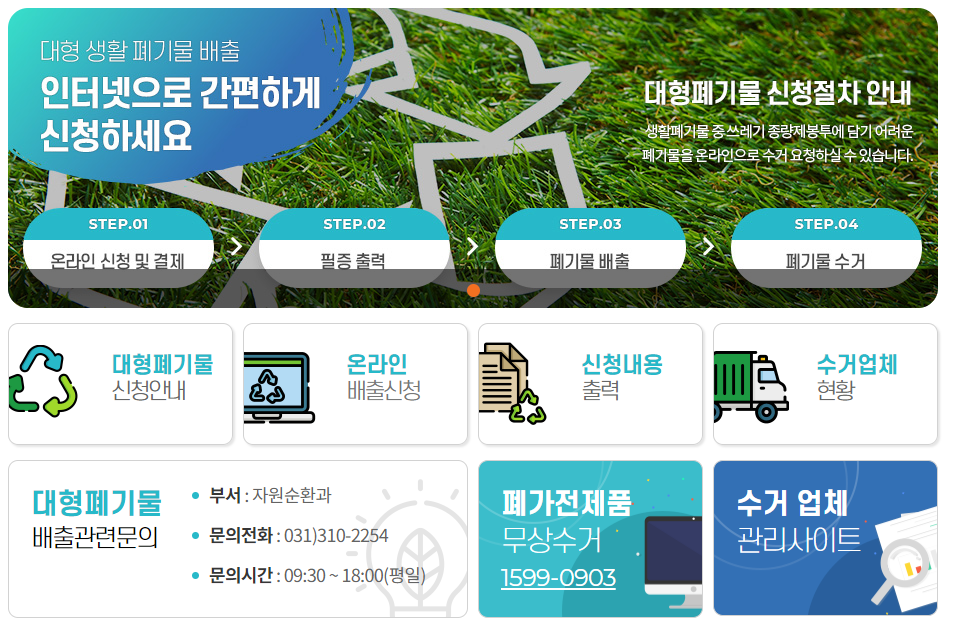 시흥시 대형폐기물 온라인 신고방법은 생각보다 매우 간단합니다. 우선 지역구 홈페이지로 접속하신 후에 대형폐기물을 검색하시면 바로 신청할 수 있는 메뉴가 나옵니다. 아래에서 조금 더 알아보겠습니다.