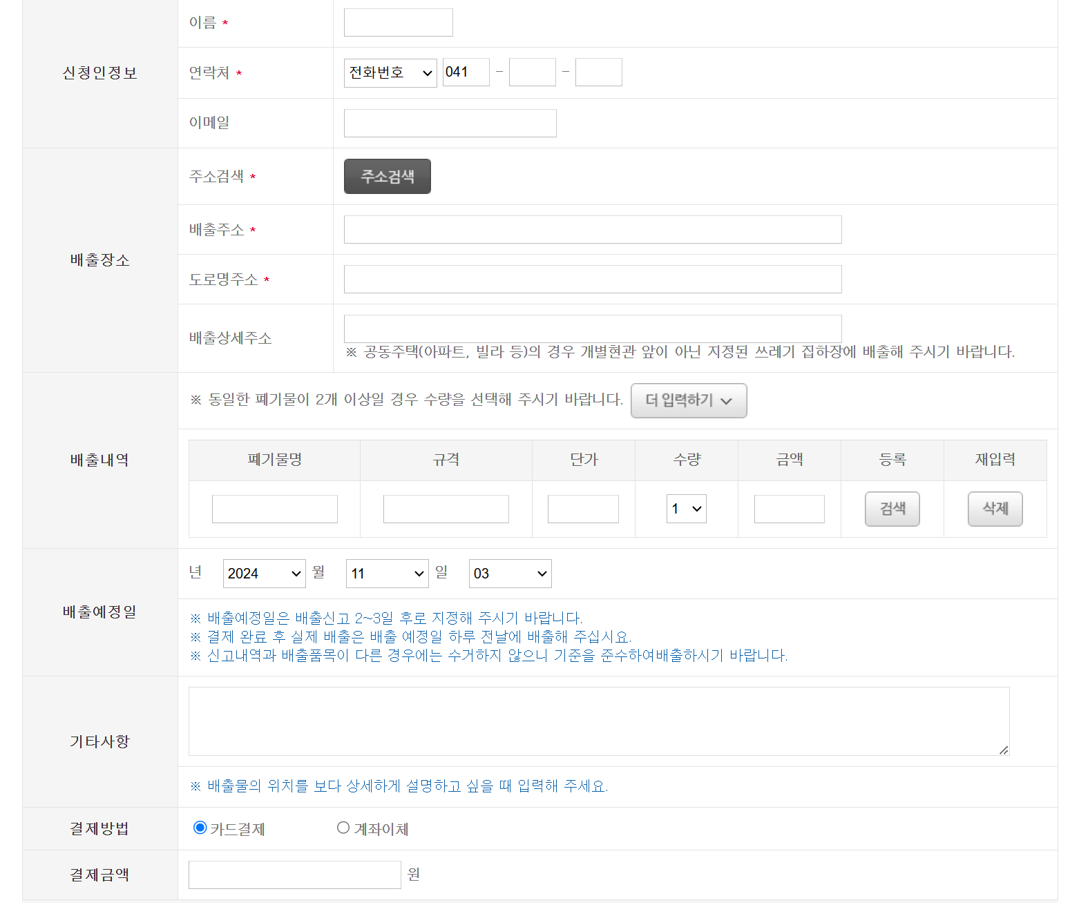 아산시청의 인터넷신고 페이지에 접속하시게 되면, 간단하게 배출자 정보, 배출장소, 배출품목 등을 입력하시고 품목에 맞는 수수료를 결제하시면 모든 과정은 쉽게 끝납니다.