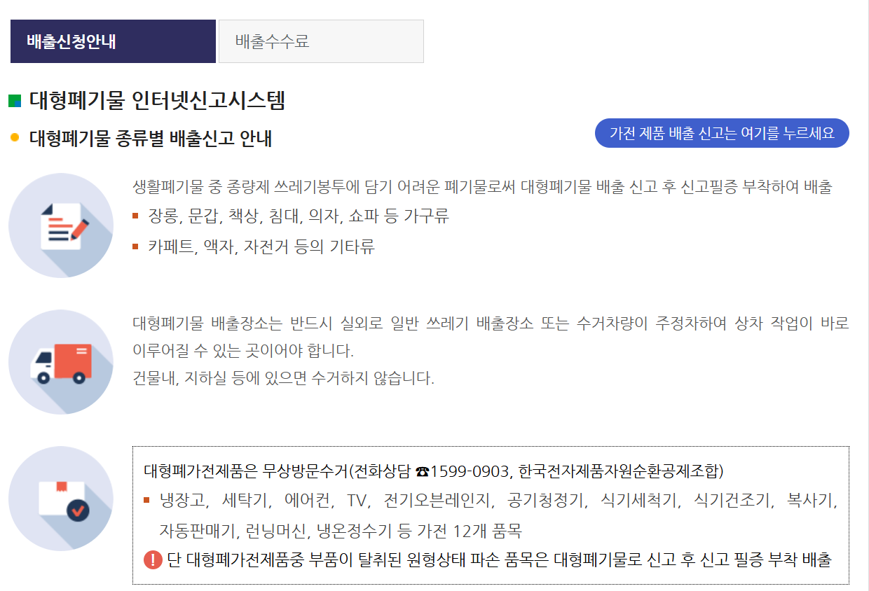 폐가구 처리 방법 고민많으셨죠? 일반적으로 폐가구는 대형폐기물은 인터넷 신고를 통해 간단하게 배출신고 가능합니다. 배출 신청자 정보와 배출 장소정보, 배출품목을 선택한 후 신청하면 스