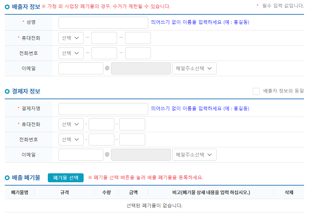 용산구청의 인터넷신고 페이지에 접속하시게 되면, 간단하게 배출자 정보, 배출장소, 배출품목 등을 입력하시고 품목에 맞는 수수료를 결제하시면 모든 과정은 쉽게 끝납니다.