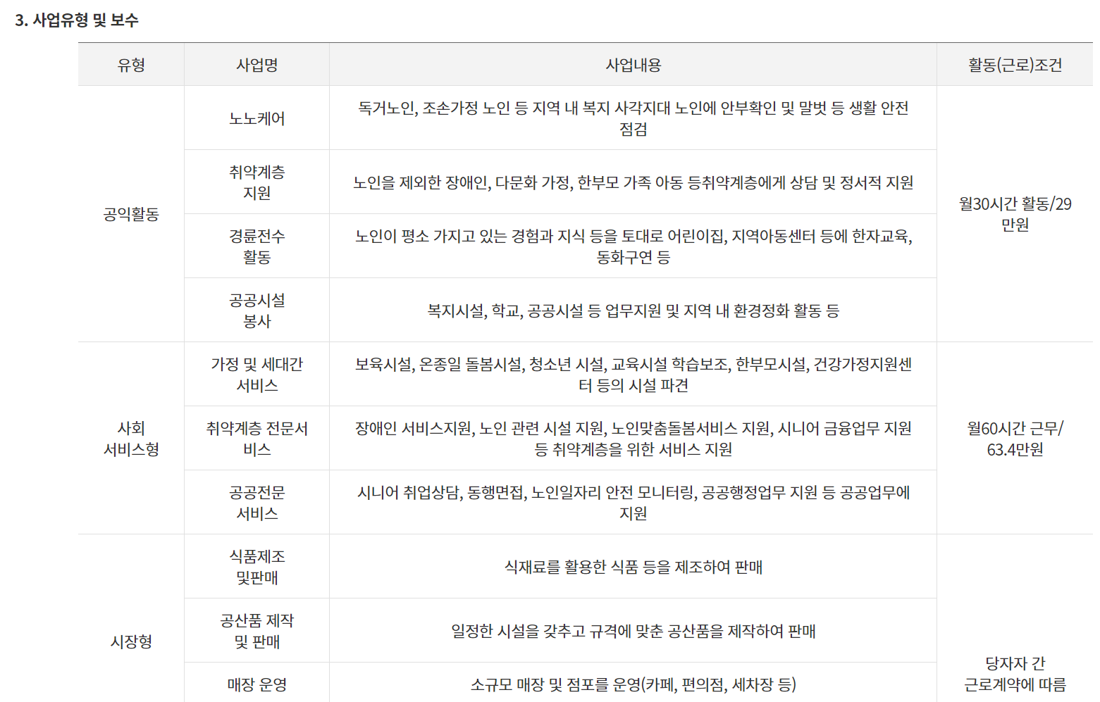 | 공공형 | 공익활동 | 노인들이 자신의 만족감과 성취감을 높이고 지역사회의 이익을 증진시키기 위해 참여하는 활동 | 지자체 경상보조 | 봉사 (사회공헌) |