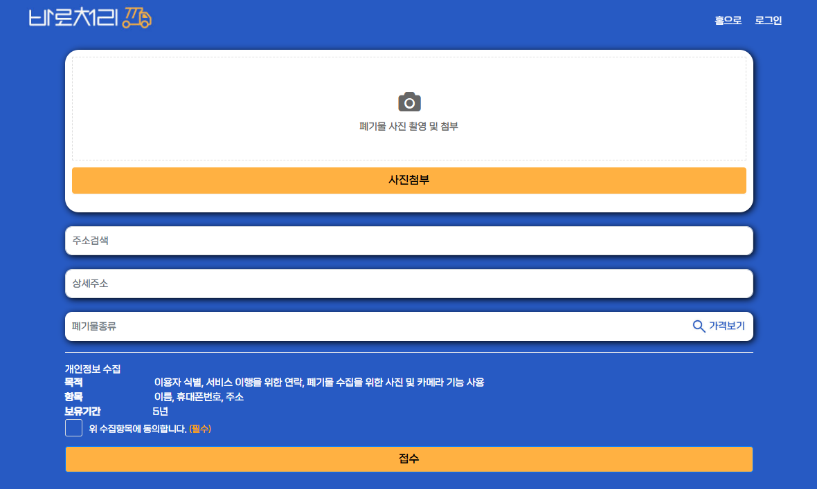 중구청의 인터넷신고 페이지인 '바로처리'에 접속하시게 되면, 간단하게 배출자 정보, 배출장소, 배출품목 등을 입력하시고 품목에 맞는 수수료를 결제하시면 모든 과정은 쉽게 끝납니다.