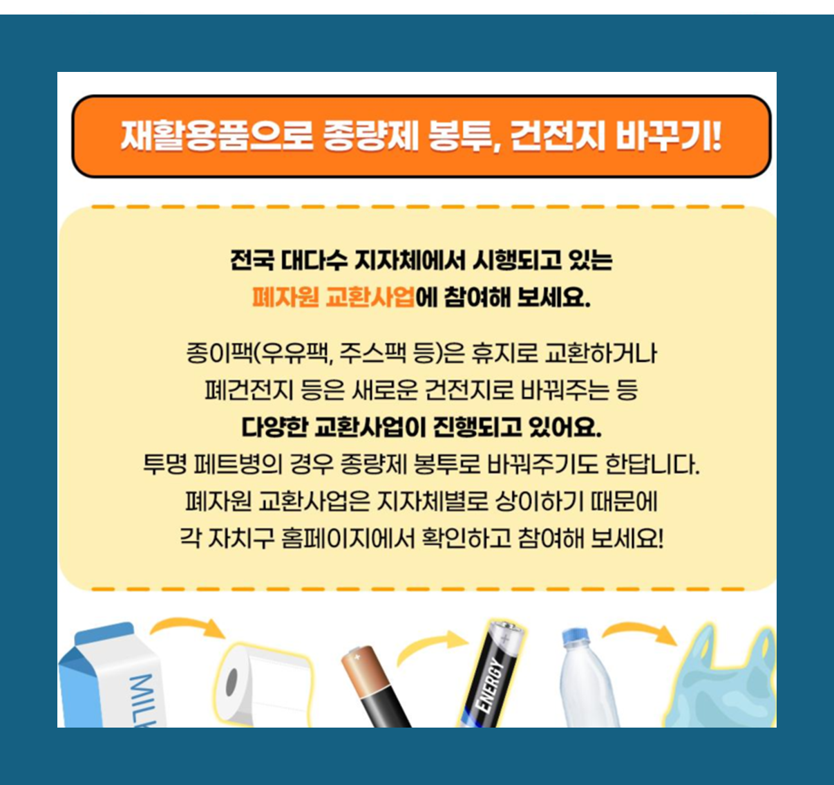 폐건전지 교환을 무상으로 가능하게 해주고, 재활용품으로 종량제 봉투와 바꾸는 사업이 이미 많은 지자체에서 시행하고 있습니다. 종이팩류(우유팩,주스팩) 은 휴지로 교환하거나 폐건전지를