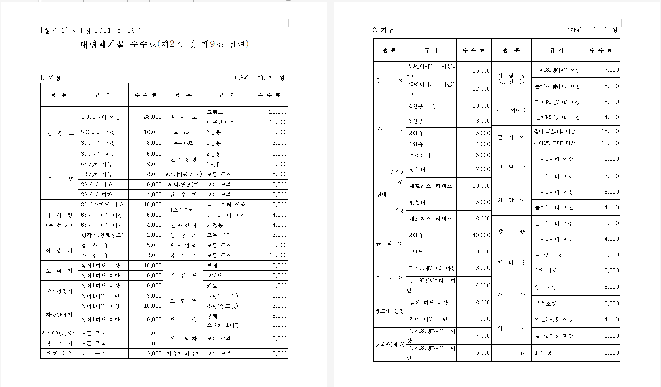 원주시 대형폐기물 배출 수수료는 아래와 같습니다.