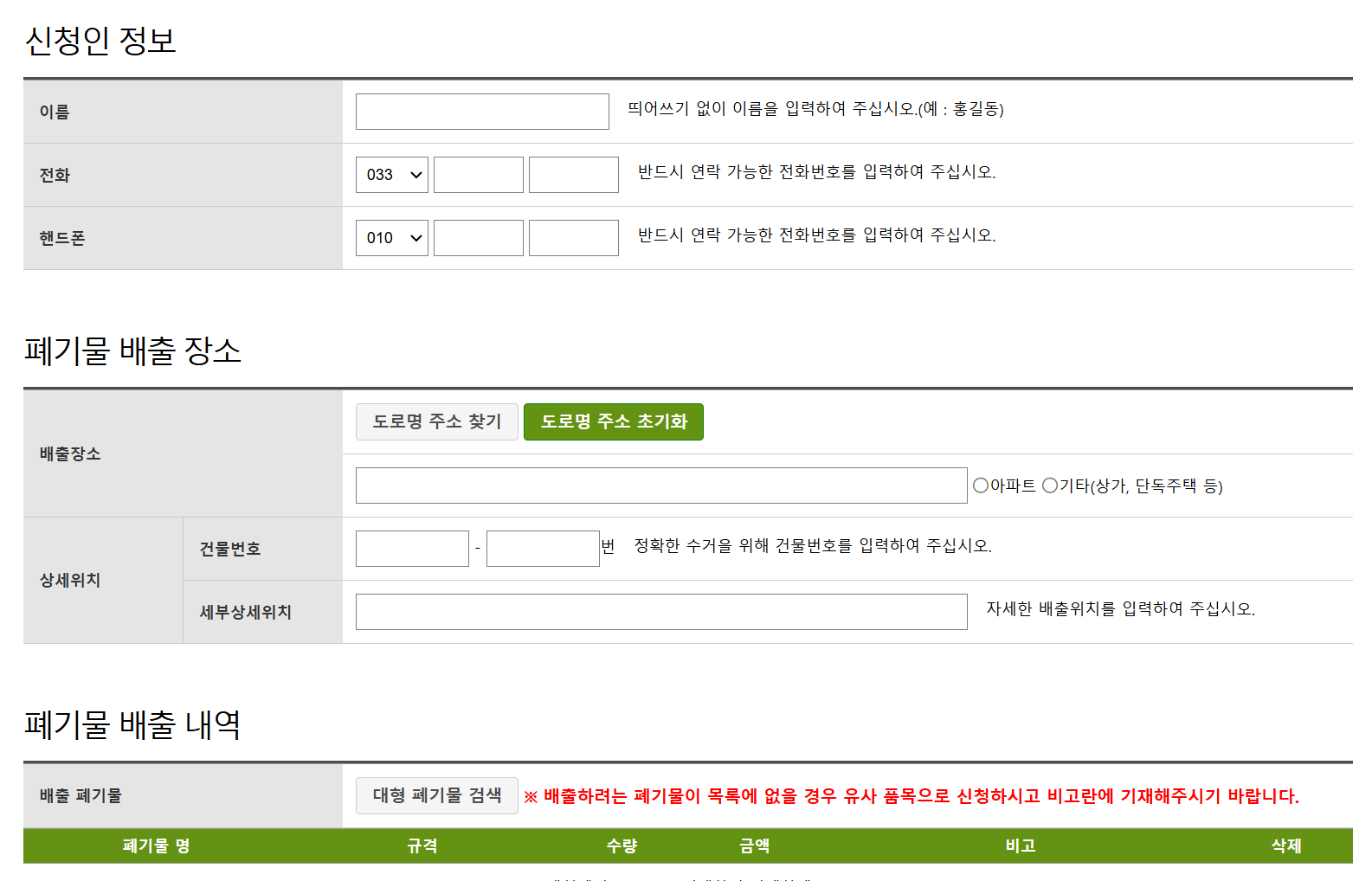 원주시청의 인터넷신고 페이지에 접속하시게 되면, 간단하게 배출자 정보, 배출장소, 배출품목 등을 입력하시고 품목에 맞는 수수료를 결제하시면 모든 과정은 쉽게 끝납니다.