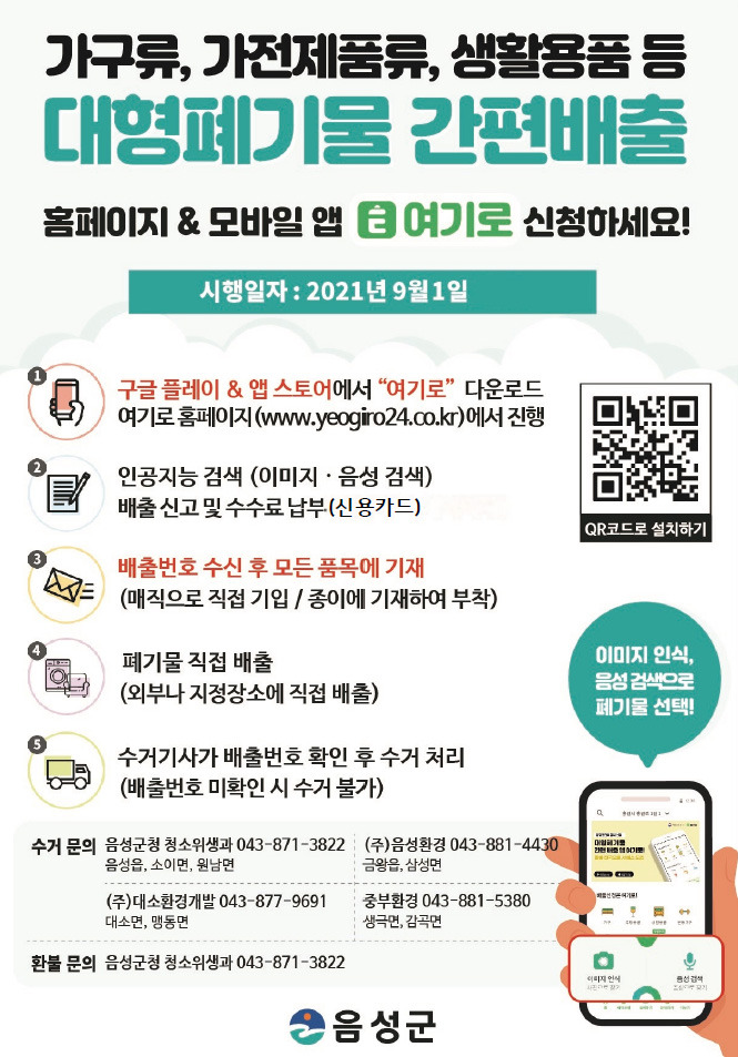 음성군청의 인터넷신고 페이지인 '여기로'에 접속하시게 되면, 간단하게 배출자 정보, 배출장소, 배출품목 등을 입력하시고 품목에 맞는 수수료를 결제하시면 모든 과정은 쉽게 끝납니다.