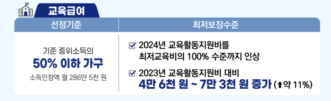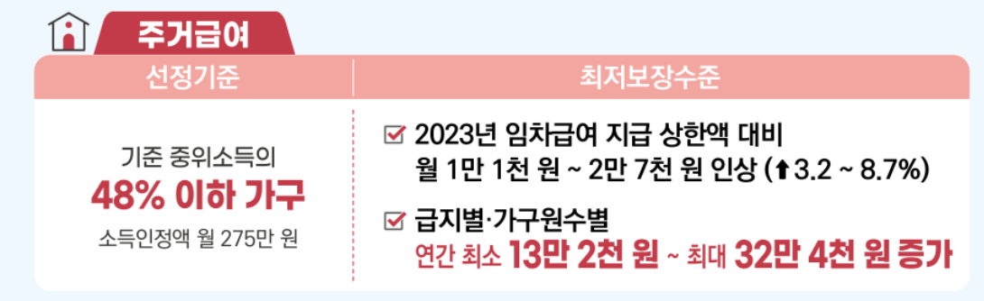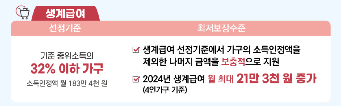각 중위소득 이하 조건에 따라 생계급여, 주거급여, 교육급여, 의료급여를 지급하도록 되어 있습니다.