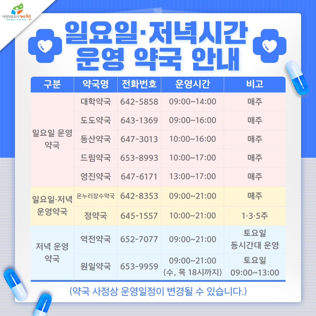 늦은 밤 또는 일요일과 같은 휴일. 예기치 못하게 약국을 방문해야한다면 당황스러우리라 생각합니다.